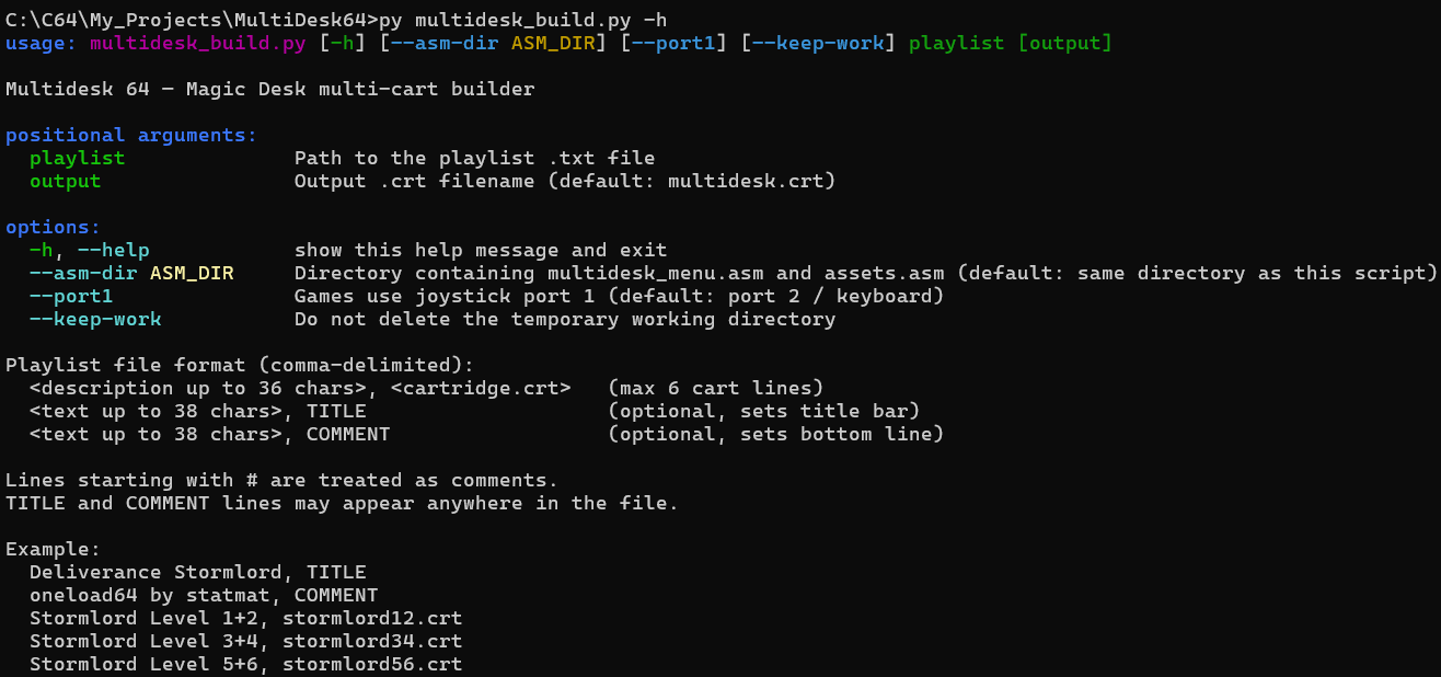 MultiDesk 64 is a very simple boot menu that uses just the first bank of a MagicDesk cart (Bank #0). It shows a menu that can switch to up to five (well, up to six) other MagicDesk carts.